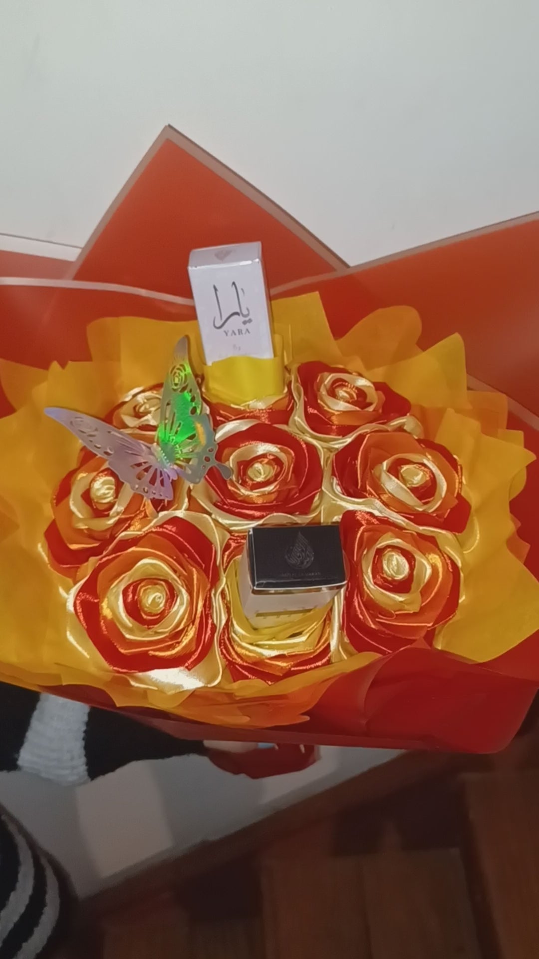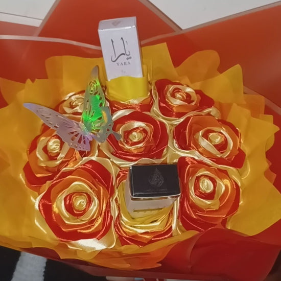 BOUQUET DE 9 ROSES DE COULEUR ORANGE,JAUNE,ROUGE. ENTOURE DE SON PAPIER DE SOIE ROUGE ET SON PETIT PAPILLON IL S ACCOMPAGNE DE 2 PARFUM RON OLL YARA ROSE ET MUSC. ET DE C EST 2 PETITE FLEUR QUI COMPLETERAS LE BOUQUET APRES AVOIR RETIRE LES 2 PARFUM.